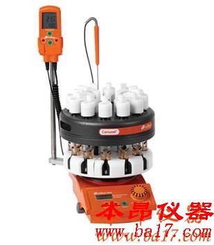 快速有效的加熱:使用Carousel 12加熱盤,可同時加熱12位反應(yīng),溫度范圍室溫到180℃(有時可達(dá)220℃)溫度精度:±0.5℃。溫度可通過加熱盤直接控制或者通過額外的溫度控制器提供更精確的溫度控制,溫度探針可插入反應(yīng)模塊或者通過反應(yīng)管的密封墊插入反應(yīng)溶液中來控制反應(yīng)模塊和反應(yīng)溶液的溫度。